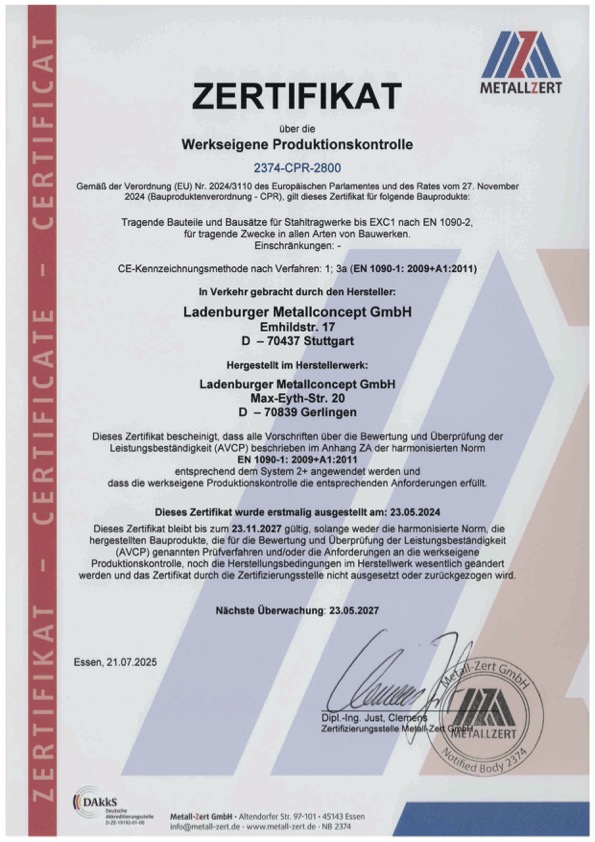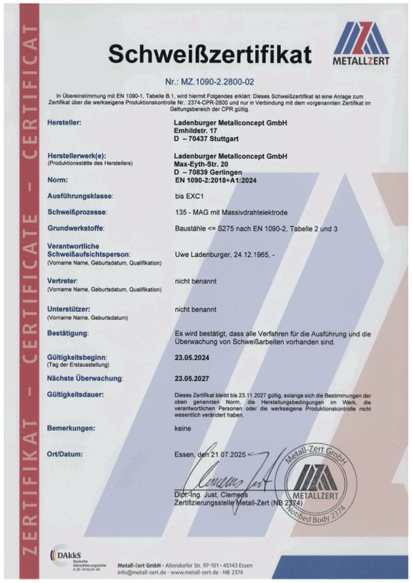 Schweißzertifikat nach EN 1090-1: 2009+A1:2011